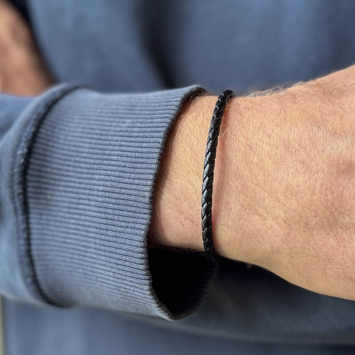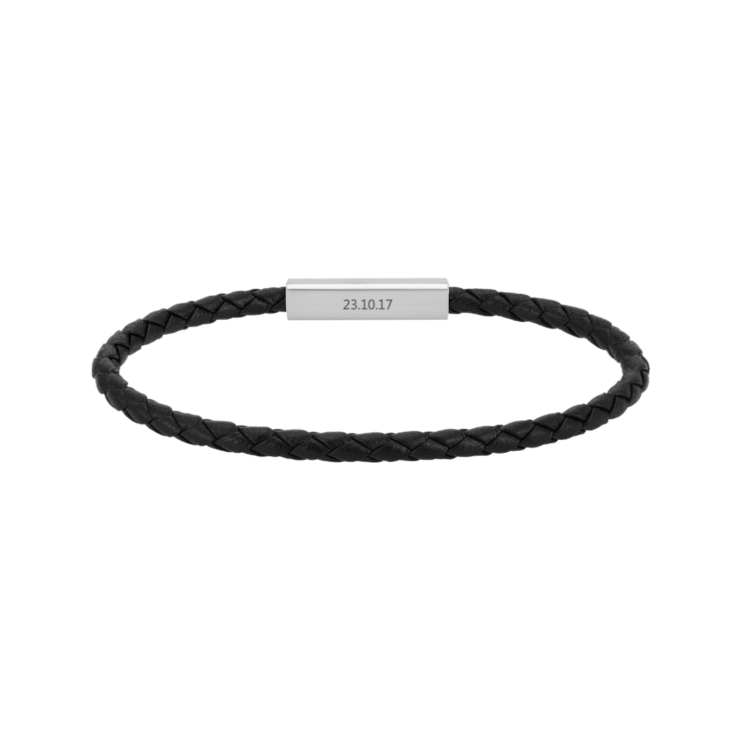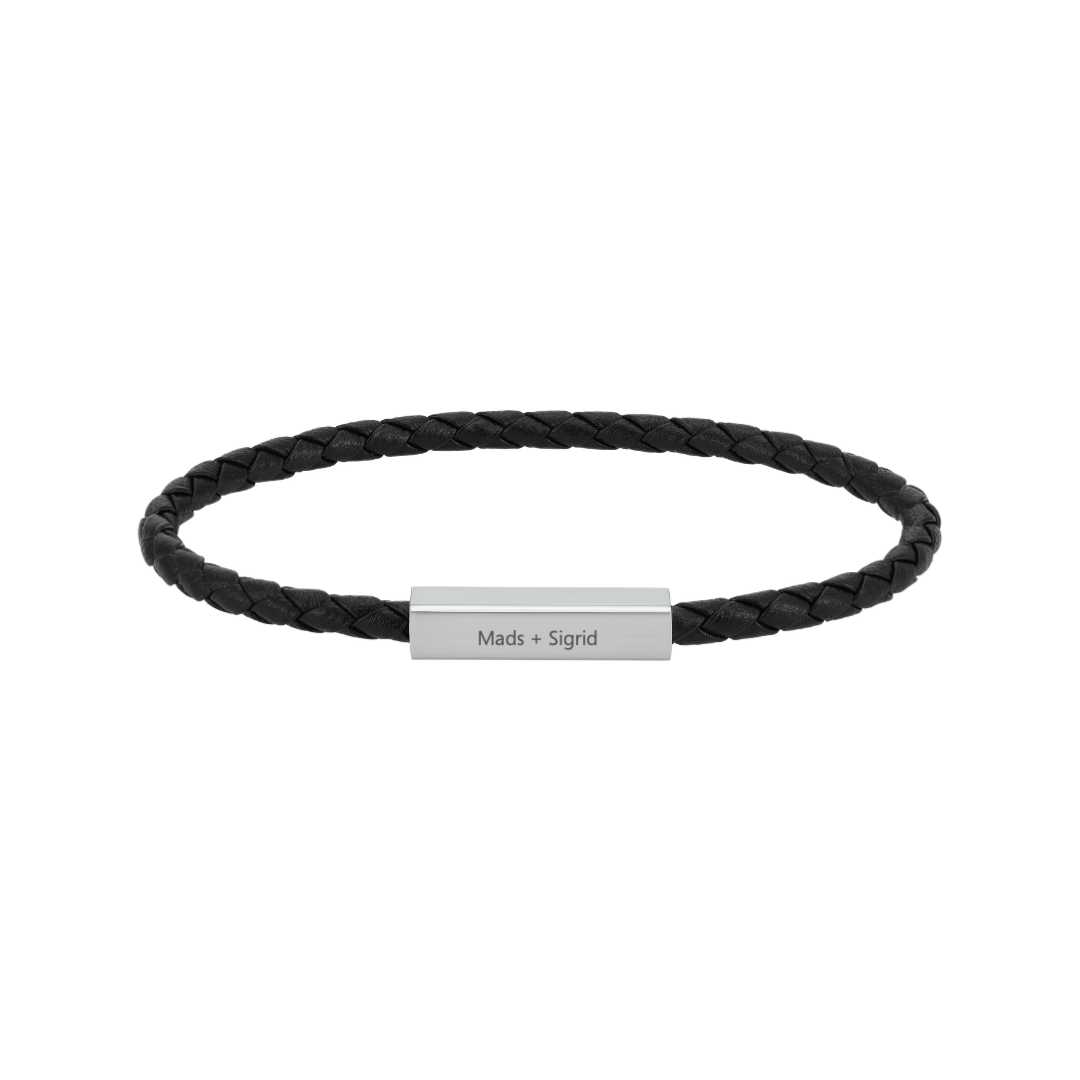 Maskulint armband i svart läder, med lås i stål. Ge armbandet en personlig touch med din helt egna text.
